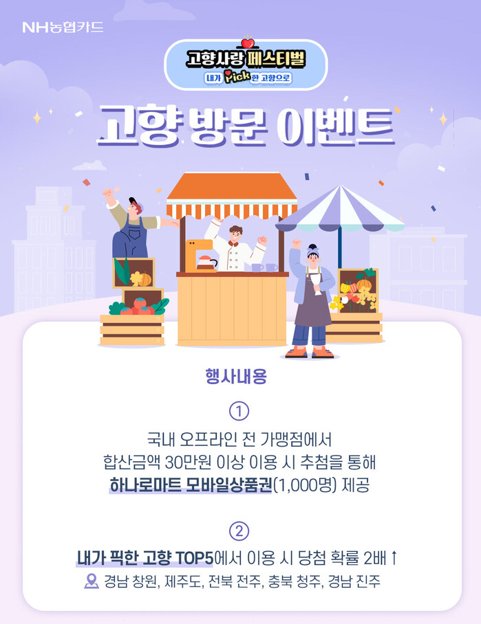 지난 5월 진행된 고향사랑 페스티벌 응원이벤트에서 최다 응원지역으로 선정된 톱5인 경남 창원, 제주도, 전북 전주, 충북 청주, 경남 진주에서 1원 이상 이용 시 당첨 확률이 2배로 높아지며, 이벤트 응모 및 자세한 내용은 NH농협카드 홈페이지 및 모바일 앱을 통해 확인할 수 있다.
