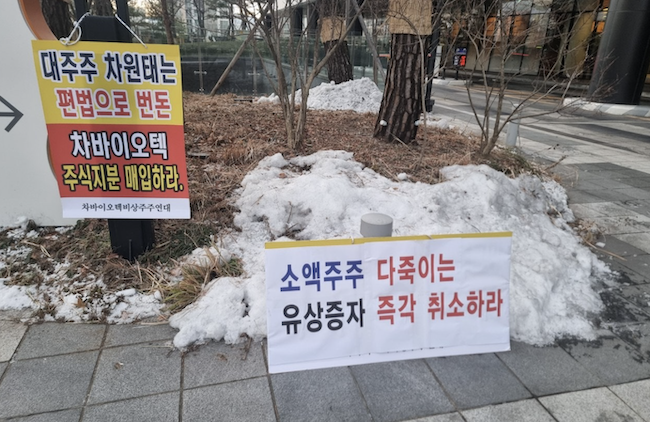| ▲ 차바이오텍 비상주주연대가 차바이오텍 사옥 앞에서 피켓 시위를 전개하고 있다.[사진=비상주주연대] |