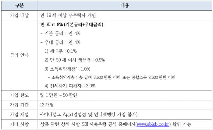 이 상품은 사이다뱅크에서 가입이 가능하며, 공공 마이데이터를 활용해 가입 및 우대금리 요건에 대한 증빙 절차를 간소화해 가입 편의성을 강화했다.