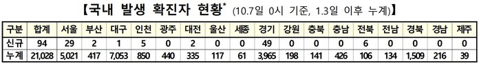 이날 국내 발생 지역별 확진자는 전날(66명)보다 28명이 늘어 다시 100명대에 육박했다.