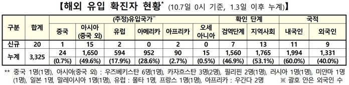 해외유입 확진자는 20명으로, 전날(9명)보다 11명이나 추가 발생했다.