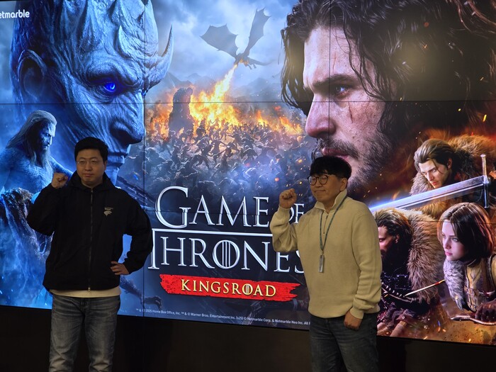 ▲문준기 넷마블 사업본부장(왼쪽)과 장현일 넷마블네오 PD가 20일 넷마블 사옥에서 진행한 '왕좌의게임: 킹스로드' 미디어 시연회를 통해기념촬영을 하고 있다. [사진=메가경제]