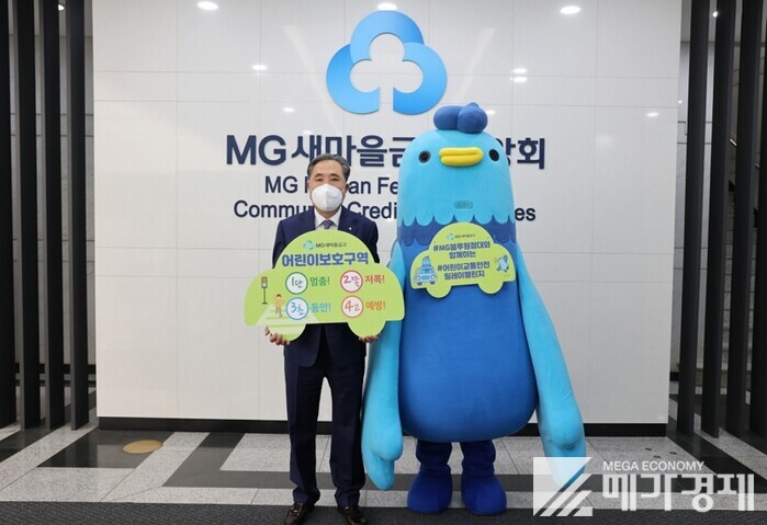 ▲ 서울 강남구 삼성동 본부회관에서 박차훈 새마을금고중앙회장(사진 왼쪽)과 새마을금고 캐릭터 ‘MG블루원정대’가 캠페인 메시지를 담은 보드를 들고 있다. [사진=새마을금고중앙회 제공] |