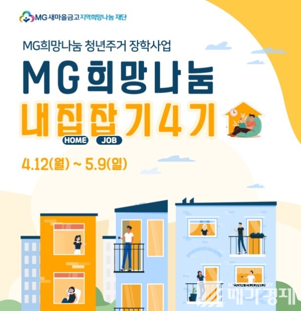 MG새마을금고 지역희망나눔재단(이사장 박차훈, 이하 MG새마을금고 재단)은 코로나19의 확산으로 심화된 구직난과 생계 곤란을 겪는 청년들의 주거 안정을 도모하고, 건강한 사회구성원으로 성장하는데 도움을 주고자 ‘2021년 MG희망나눔 청년주거장학사업 내집(Home)잡(Job)기’4기 프로그램을 모집한다.