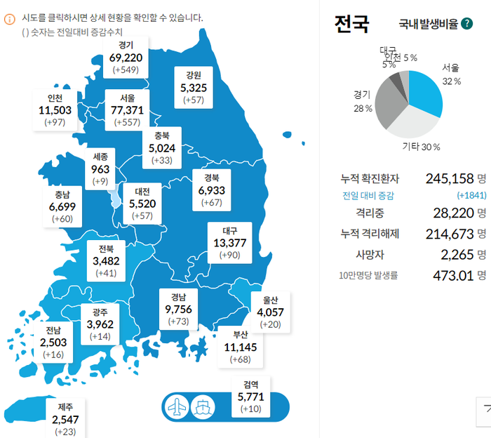 중앙방역대책본부는 27일 0시 기준으로 1841명의 코로나19 신규 확진자가 발생해 지금까지 누적 확진자는 24만5158명(해외유입 1만3355명)으로 집계됐다고 밝혔다.