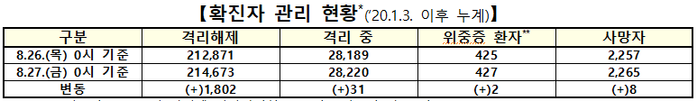 ▲ 27일 0시 기준 코로나19 현황. [출처=중앙방역대책본부] |