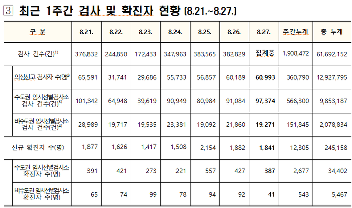 ▲ 최근 1주간 검사 및 확진자 현황. [출처=중앙방역대책본부] |