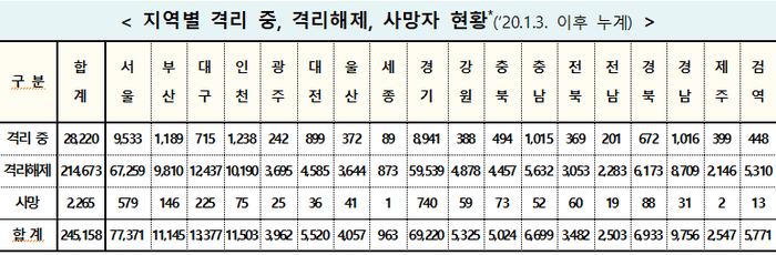 ▲ 27일 0시 기준 코로나19 지역별 격리 및 사망자 현황. [출처=중앙방역대책본부] |