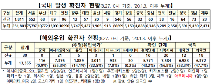 ▲ 27일 0시 기준 코로나19 시도별 현황. [출처=중앙방역대책본부] |