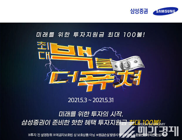 ▲ 삼성증권(사장 장석훈)이 신규 고객 또는 2015년 1월 1일부터 2021년 4월 30일까지 해외주식 거래 경험이 없었던 고객을 대상으로 최대 100달러를 지원하는 '백불 더퓨처' 이벤트를 5월 31일까지 연장해 진행한다. [사진=삼성증권 제공] |