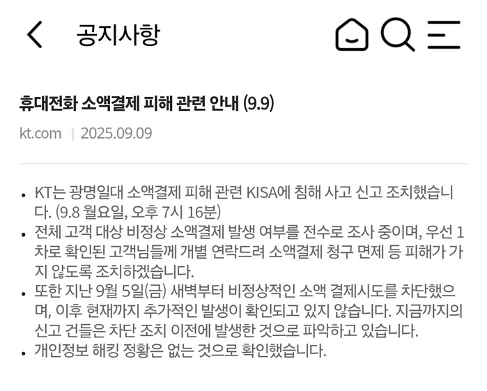 KT는 이번 사태와 관련해 사과하며, 피해 고객 대상 조치를 진행 중이라고 밝혔다. KT 관계자는 “전체 고객을 대상으로 비정상 소액결제 발생 여부를 전수 조사하고 있으며, 1차로 확인된 고객에게는 개별 연락해 조치를 취하고 있다”며 “지난 5일부터 비정상적인 소액결제 시도를 차단했고 현재까지 추가 피해는 없다”고 설명했다.