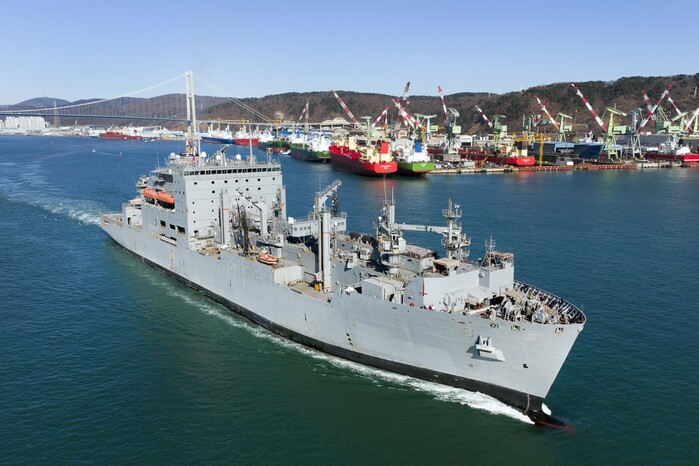 | ▲지난 6일 울산 HD현대중공업 중형선사업부 인근 부두에서 미 해군 소속 'USNS 앨런 셰퍼드'함이 정기 정비를 마치고 출항하는 모습[사진=HD현대] |