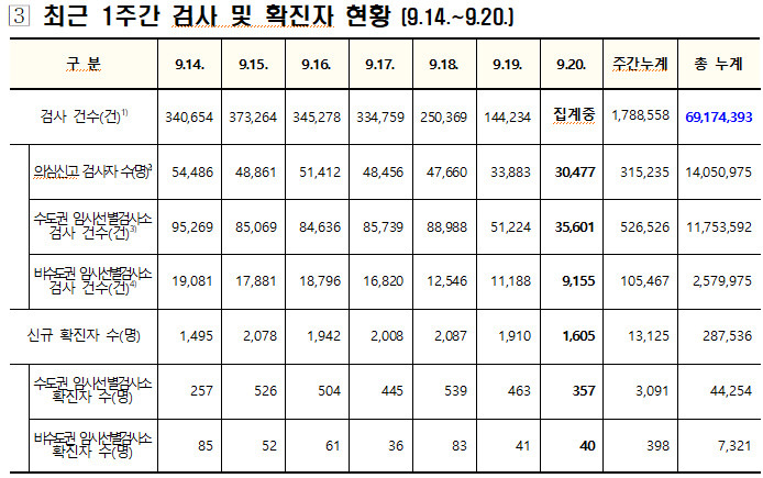 ▲ 최근 1주간 검사 및 확진자 현황. [출처=중앙방역대책본부] |