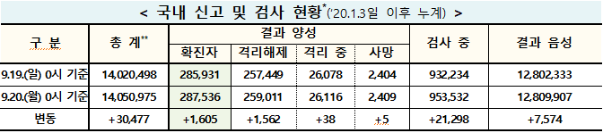 중앙방역대책본부(방대본)는 20일 0시 기준으로 코로나19 신규 확진자가 1605명 발생해 지금까지 누적 확진자는 28만7536명(해외유입 1만4190명)으로 집계됐다고 밝혔다.
