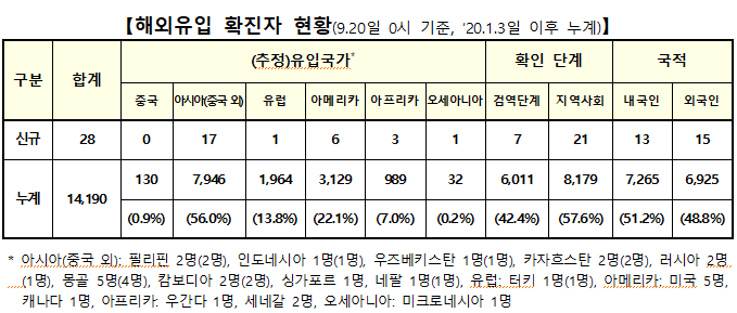 해외유입 확진자 28명 중 7명은 입국 검역단계에서 나왔고, 나머지 21명(서울 5명, 경기 4명, 광주 3명, 경북·경남·제주 2명, 울산·충북·충남 각 1명)은 지역사회에서 자가격리중 확진됐다. 국적별로는 내국인 13명, 외국인 15명이다.
