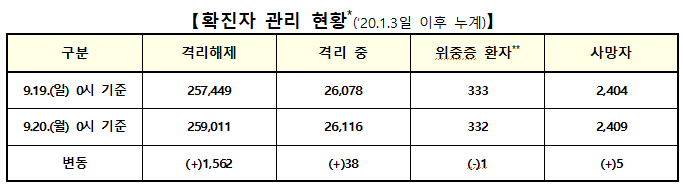 전날 하루 1562명 추가 완치돼 누적 격리해제자는 25만9011명이 됐고, 격리치료 중인 환자는 총 2만6116명으로 38명이 늘었다.