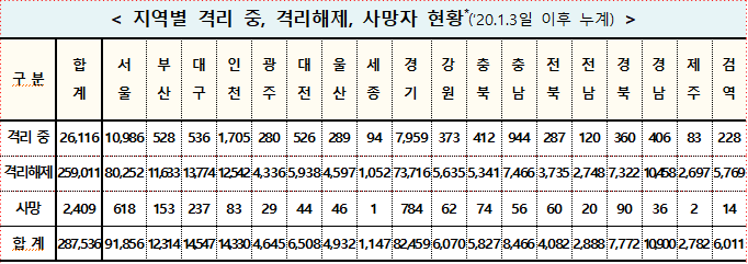 ▲ 20일 0시 기준 코로나19 지역별 격리 및 사망자 현황. [출처=중앙방역대책본부] |