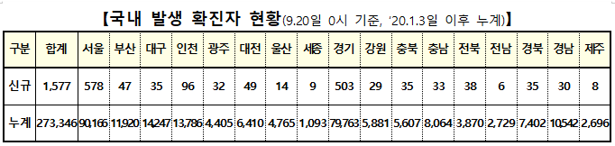신규 확진자수를 감염경로별로 보면 전국 곳곳에서 감염된 것으로 추정되는 국내발생(이하 지역발생)은 1577명이고 해외유입은 28명이다. 전날보다 지역발생은 294명이 적고 해외유입은 11명이 많다. 전국 17개 광역지자체 시도에서 모두 지역발생 확진자가 나왔다.