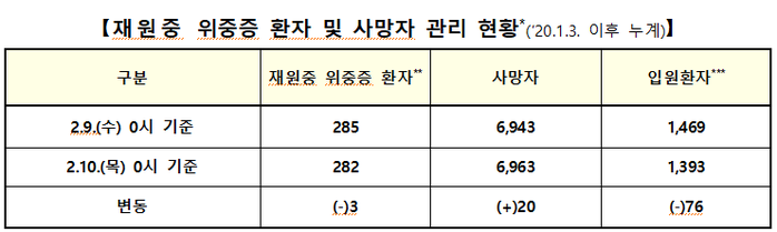 ▲ 10일 0시 기준 코로나19 위중증 환자 및 사망자 관리 현황. [질병관리청 제공] |