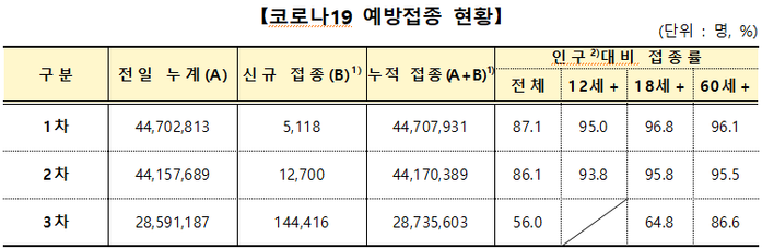 코로나19 백신 접종 완료율(2차까지 기본접종을 마친 비율)은 이날 0시 기준 86.1%(누적 4417만389명)다. 12세 이상 93.8%, 18세 이상 95.8%, 60세 이상 95.5%이다.