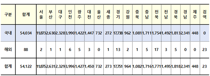 이날 신규 확진자 중 국내 지역발생은 5만4034명, 해외유입은 88명이다. 해외유입 확진자가 100명 아래를 기록한 것은 지난해 12월 28일(88명) 이후 처음이다.
