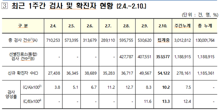 ▲ 최근 1주간 검사 및 확진자 현황. [질병관리청 제공] |