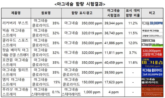 성분 함량 문제도 도마에 올랐다. 조사 대상 20개 중 8개 제품이 마그네슘 화합물을 사용하고 있었지만, 실제 마그네슘 함량은 제품별로 4~41,886ppm까지 큰 차이를 보였다.