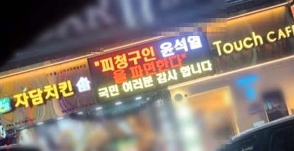 [메가경제=주영래 기자] 헌법재판소가 윤석열 대통령을 파면 선고한 지난 4일, 자담치킨 한 가맹점이 "피청구인 윤석열을 파면한다. 국민 여러분 감사합니다"라는 문구를 전광판에 표시하면서 논란이 증폭되고 있다.