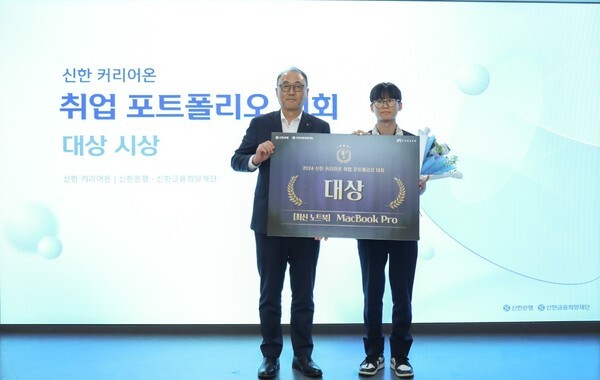 | ▲지난 29일 서울시 중구 명동에 위치한 '신한 익스페이스'에서 진행된 ‘신한 커리어온 4기 취업 포트폴리오 대회’에서 신한은행 김기흥 경영지원그룹장(왼쪽)이 대상을 수상한 경기게임마이스터고등학교 이도윤 학생(오른쪽)과 기념 촬영하는 모습. [사진=신한은행 제공 |