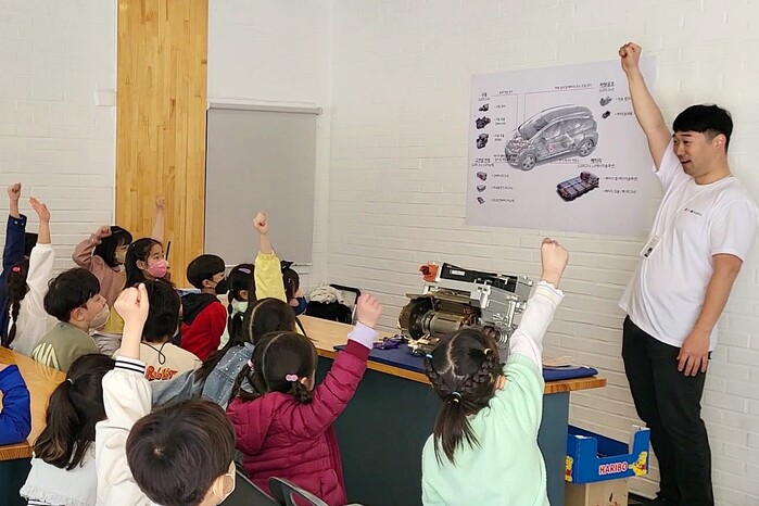 LG마그나 직원들은 일일 선생님이 돼 전기차 구동 원리를 초등학생들이 이해하기 쉽도록 설명했다.