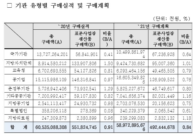 현행 「장애인고용촉진 및 직업재활법」은 장애인에게 안정된 일자리를 제공하는 장애인 표준사업장의 판로 확대를 위해 공공기관별로 총 구매액의 0.6% 이상을 할애하도록 규정하고 있다.