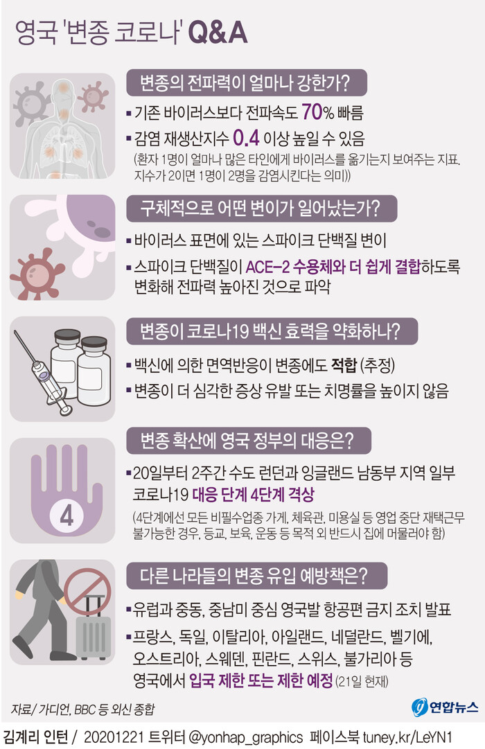 영국에서 전파력이 강해진 변종 바이러스가 발견됨에 따라 영국은 변종이 확인된 일부 지역에 봉쇄령을 내리는가 하면, 유럽과 아시아를 중심으로 영국발 항공기 운항을 중단하는 국가가 늘어나고 있다.