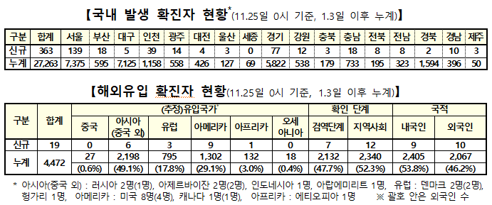 382명 중 국내발생(지역발생)은 363명, 해외유입은 19명이었다. 이중 수도권 지역발생자는 서울 139명, 인천 39명, 경기 77명 등 255명이 됐다.