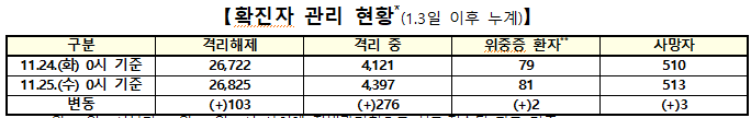 ▲ 25일 0시 기준 코로나19 확진자 관리 현황. [출처= 중앙방역대책본부] |