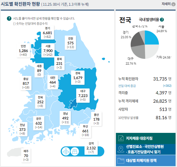 ▲ 25일 0시 기준 코로나19 시도별 확진환자 현황. [출처= 중앙방역대책본부] |