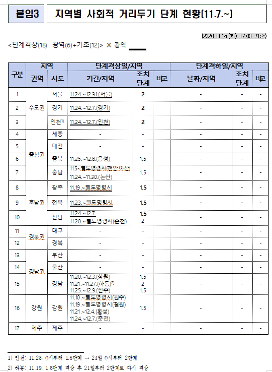 ▲ 지역별 사회적 거리두기 단계 현황. [출처= 중앙재난안전대책본부] |