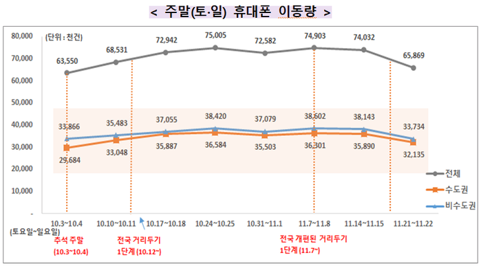 이런 가운데 지난 주말 휴대전화 이동량은 직전 주말보다 수도권 10.5%를 비롯해 전국에서 11% 감소한 것으로 나타났다.
