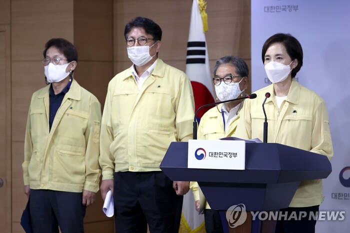▲ 교육부 장관이 25일 정부서울청사에서 조희연 서울시교육감, 이재정 경기도교육감, 도성훈 인천시교육감과 함께 수도권 유·초·중·고 원격수업 전환 발표를 하고 있다. [서울= 연합뉴스] |