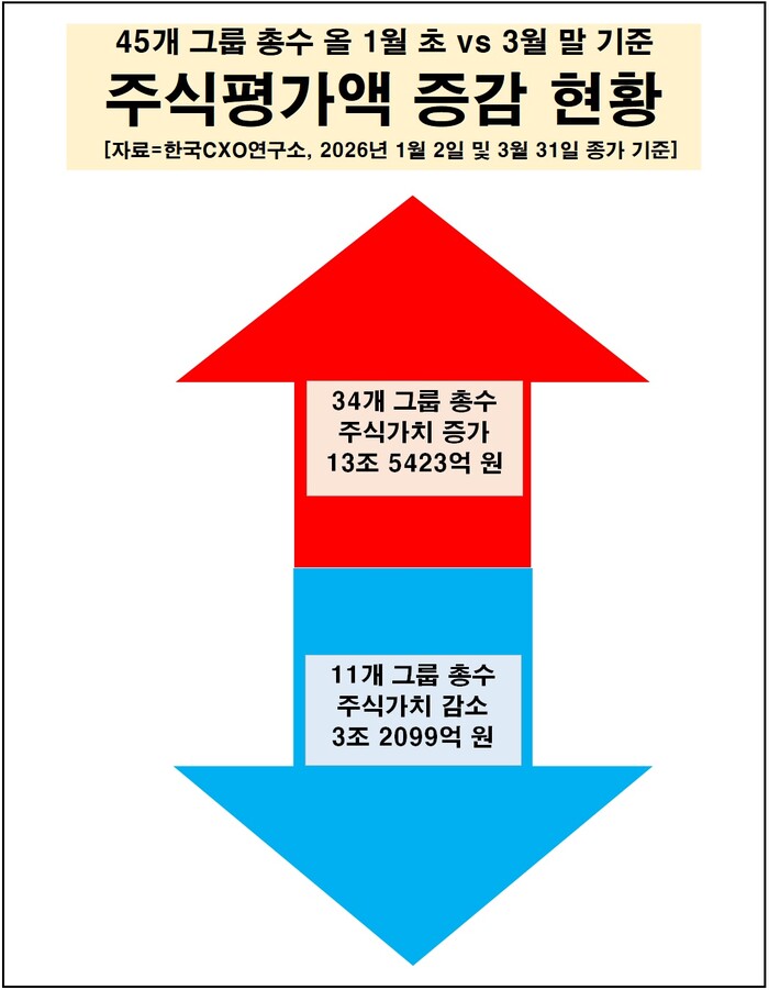 기업분석전문 한국CXO연구소는 2일 '2026년 1월 초 대비 3월 말 기준 1분기 주요 그룹 총수 주식평가액 변동 조사' 결과를 발표했다.