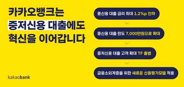 카카오뱅크는 올해 중‧저신용 고객 대상 신용대출 상품의 금리인하 및 최대 7000만원으로 대출한도 확대 등 중‧저신용 고객 대상 대출 확대를 위한 방안을 실행하고 있다.