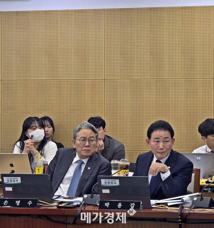▲ 국회 국토교통위원회 박용갑 의원이 한국철도공사가 계약한 다원시스 건에 대해 질의를 마치고 맹성규 국토위원장의 발언을 듣고 있다.(사진 좌부터 손명수 의원, 박용갑 의원)  [사진=문기환 기자]