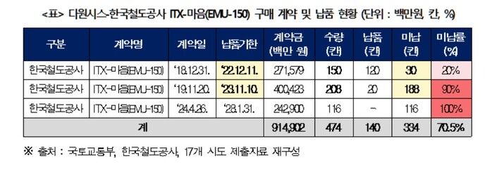 코레일, ITX- 마음 납품 지연·부실 제작에도 2024년 다원시스와 추가 계약