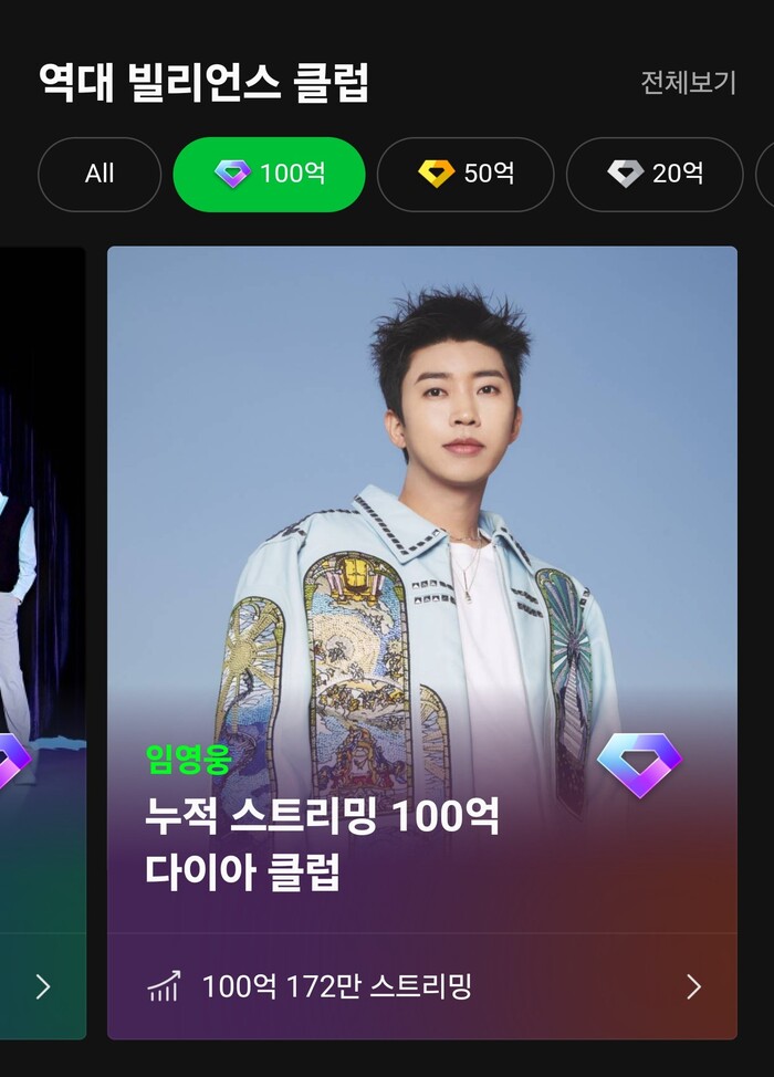 임영웅은 남자 솔로 가수 최초로 100억 스트리밍을 달성한 가수가 됐다. 앞서 ‘다이아 클럽’에 이름을 올린 가수로는 방탄소년단(BTS)이 유일했다.