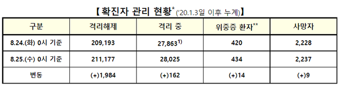 ▲ 25일 0시 기준 코로나19 확진자 관리 현황. [출처=중앙방역대책본부] |