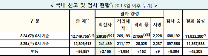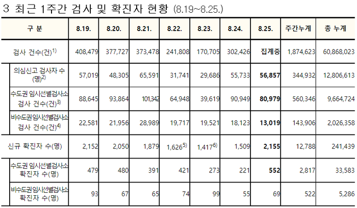 중앙방역대책본부(방대본)는 이날 0시 기준 신규 확진자가 2155명이나 발생하며 누적 24만1439명(해외유입 1만3272명)으로 집계됐다고 밝혔다. 전날(1509명)보다 무려 646명이나 폭증한 수치다.