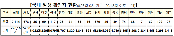 신규 확진자 2155명 중 전국 곳곳에서 감염된 국내발생(이하 지역발생)은 2114명이고 해외유입은 41명이다. 전날보다 지역발생은 644명이 급증했고 해외유입은 2명이 늘었다. 전국 17개 광역지자체 시도에서 모두 지역발생 확진자가 나왔다.