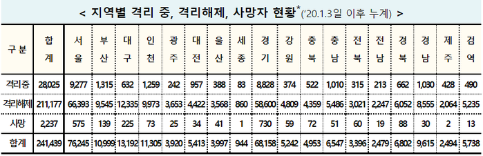 ▲ 25일 0시 기준 코로나19 지역별 격리 및 사망자 현황. [출처=중앙방역대책본부] |