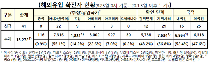 해외유입 확진자 41명 중 12명은 입국 검역단계에서 확인됐고, 29명(경기 8명, 서울 4명, 인천·울산 각 3명, 대구·충남·전북·경북·경남 각 2명, 전남 1명)은 지역사회에서 자가격리중 확진됐다. 국적별로는 내국인 16명, 외국인 25명이다.