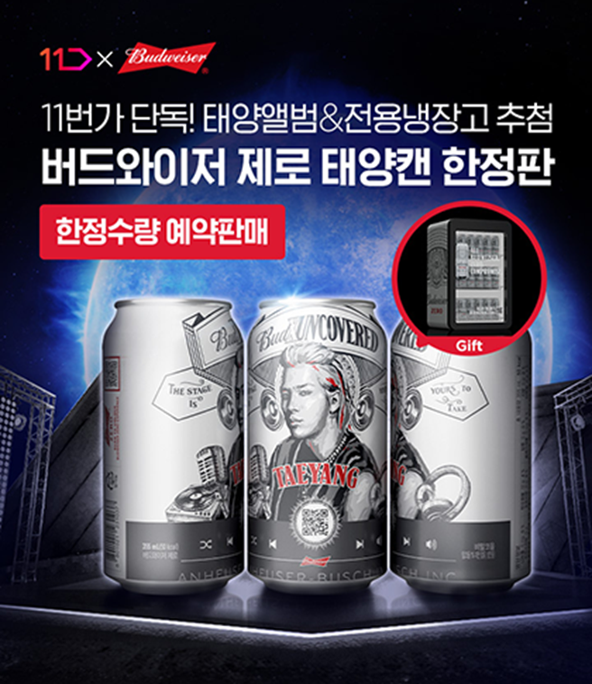 [메가경제=김형규 기자] 11번가는 글로벌 맥주 브랜드 '버드와이저'가 아티스트 태양과 협업해 출시한 논알코올 음료 '버드와이저 태양 한정판 제로 캔'을 온라인 최초로 공개하고 31일부터 단독 예약판매를 시작한다고 밝혔다.