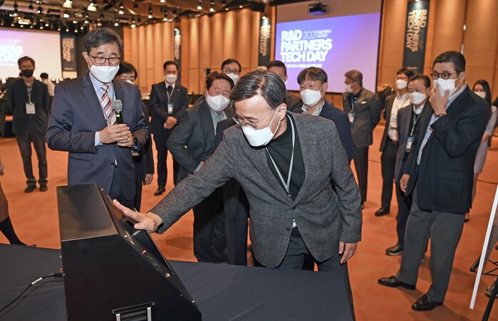 | ▲ 박정국 사장이 최우수상 신기술 전시물을 살펴보고 있는 모습 [사진=현대차·기아 제공] |